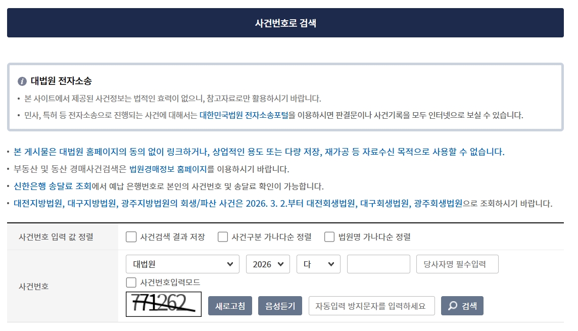 이 방법을 이용하면 사이트 메뉴를 일일이 찾지 않아도 바로 사건 조회 화면으로 이동할 수 있어서 편리해요.