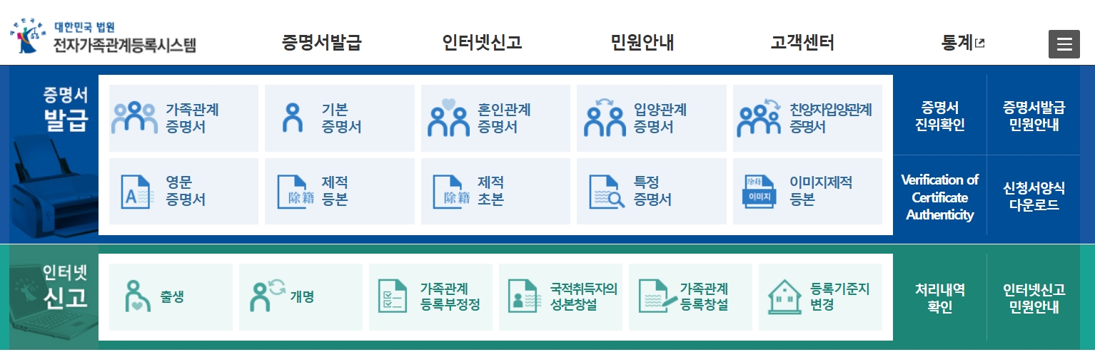 - 가족관계증명서, 기본증명서, 혼인관계증명서 발급 가능